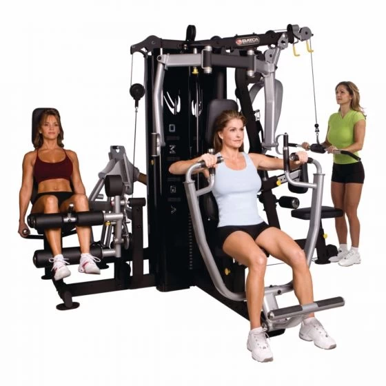 The four weight stack gym system measures 9’4”L x 8’1”W x 7’1”H and weighs 1,339 lbs. without the leg press and 9’4”L x 9’W x 7’1”H and weighs 1,755 lbs. with the leg press