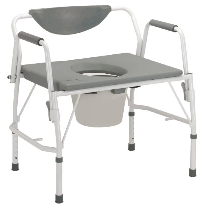 Designed to withstand a weight capacity of 1000 pounds, the Drive Bariatric Drop-Arm Commode uses heavy-duty construction to give patients with limited mobility and weak lower extremities a safe place to rest. The sturdy gray powder-coated steel construction provides users with security that is easy to maintain. A 12-quart commode bucket and cover easily slide on and off from behind. The open area underneath the commode allows for it to fit over an existing toilet or be used as a toilet safety frame.