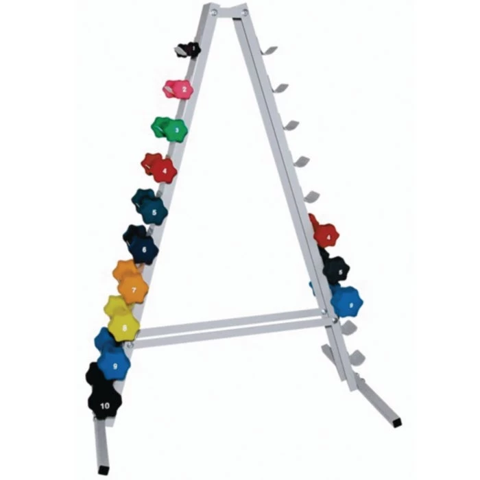 Stable A-frame design holds up to 20 small dumbbells, made of welded steel.