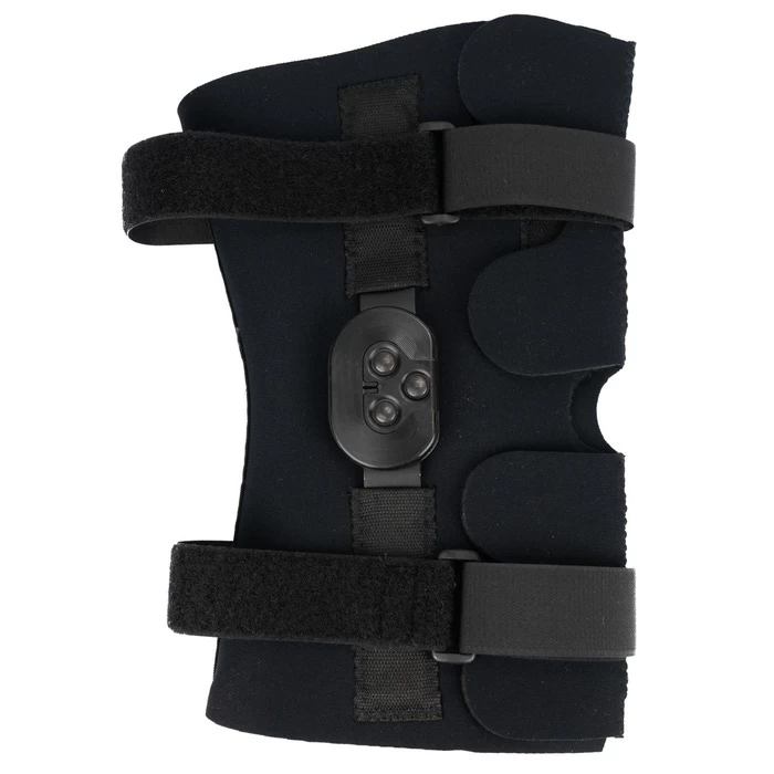 - Locking hinges for stability (ROM stops in flexion and extension at 0, 10, 30, 50, 70, 90, 110)